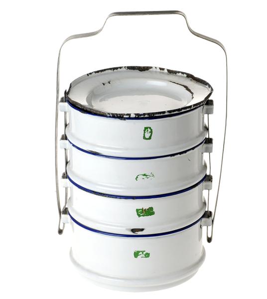 Mathämtare bestående av fyra skålar som står ovanpå varandra och hålls ihop av bygelhandtag som träs genom byglar på respektive skål. Överst ett tallrikslock. Skålarna är vita med blå fals. Emaljen på locket sprucken. Användes till sjuk personal.