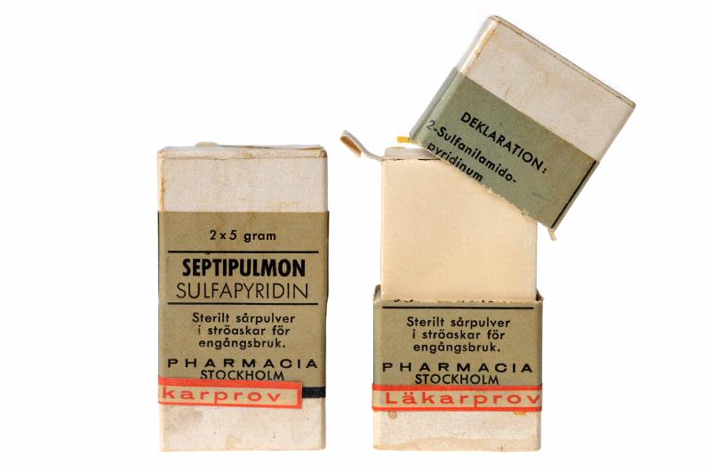 Två vita askar med 2x5 g Sulfapyridin. Grå etiketter med svart text: "Septipulmon Sulfapyridin Sterilt sårpulver i ströaskar för engångsbruk Pharmacia Stockholm". Liten vit etikett med röd text: "Läkarprov".