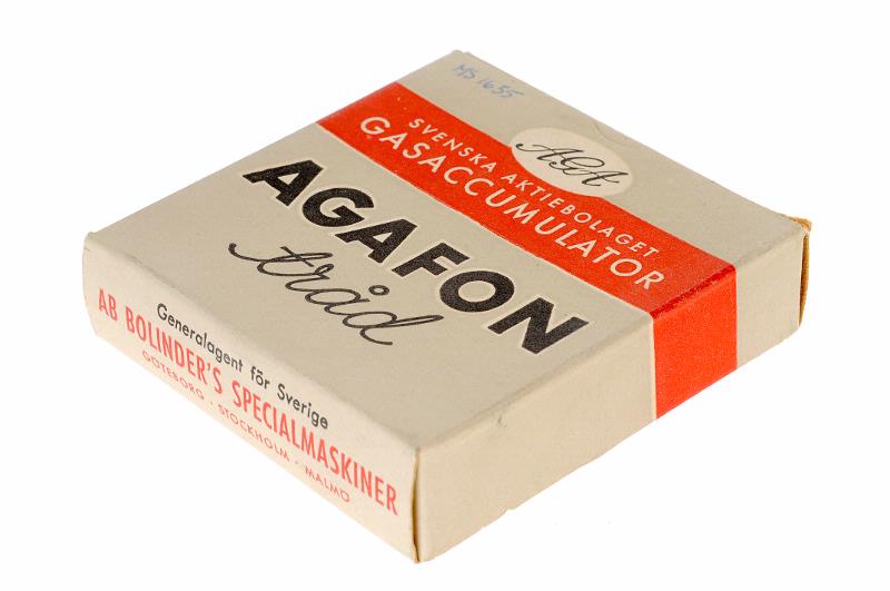MS 1635. Spole med Agafon-tråd. Ligger i pappask märkt: "AGA Svenska Aktiebolaget Gasaccumulator". "Generalagent för Sverige AB Bolinder's Specialmaskiner Göteborg - Stockholm - Malmö". Spolens diam 70 mm höjd 15 mm. Märkt: "AGA". Av gråmålad metall. Ett avlångt hål på spolen visar hur mycket som finns kvar av tråden och är graderat med fem skalstreck.