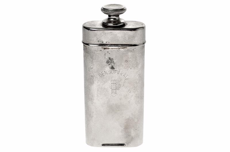 MS 5758. Metalletui med lock som skjuts på och sedan skruvas fast. Plats för spruta och 4 st kanyler (sprutan saknas). 2 av kanylerna är märkta Heufirm Chrom och 2 är märkta 20 Acufirm V2 A. Etuiet är märkt Densoparat, H 115 mm. Har tillhört stadsläkare PG Månsson, Trelleborg.