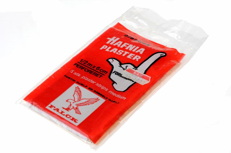 - Röd förpackning i påse med vitt pekande finger. Vit och svart text: "elastisk HAFNIA PLASTER ½ mx6 cm perforeret, 5 st plaster strips medium Hurtig forbinding, FALCK". Tillhör innehållet i förbandslåda MS 11260.
