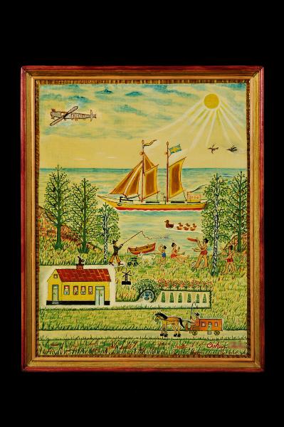- Målning, inramad och lackerad, strandmotiv med badande, ett skepp och i förgrunden ett hus med trädgård och på vägen framför, en man körande häst och vagn.