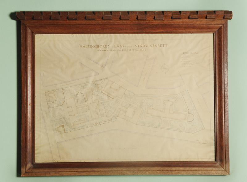 - Inglasad och inramad, brun ram. På teckningen syns lasarettsområdet med omgivande gator. Byggnaderna är numrerade 1-7. Text överst: "Hälsingborgs Läns- och Stadslasarett, Situationsplan av lasarettsområdet". Högt upp till höger: "Förteckning: 1. Kirurgisk avdelning, 2. Medicinsk avdelning, 3. Öron, 4. Röntgen, 5. Kontor och Syssloman, 6. Kök och Tvätt, 7. Gravkapell". Signerad i nedre, högra hörnet: "Malmö Juni 27" samt ett svårläst namn, troligen Salomon Sörensen.