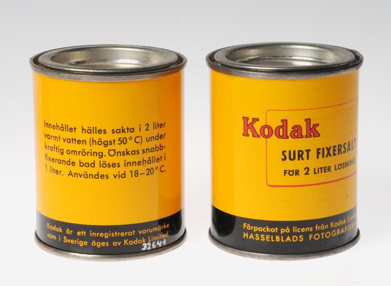 - Oöppnade, runda, gula burkar med röd och svart text: Kodak surt fixersalt för 2 liter lösning, Förpackat på licens från Kodak Limited av Hasselblads Fotografiska AB. Bruksanvisning finns tryckt på burkarna.