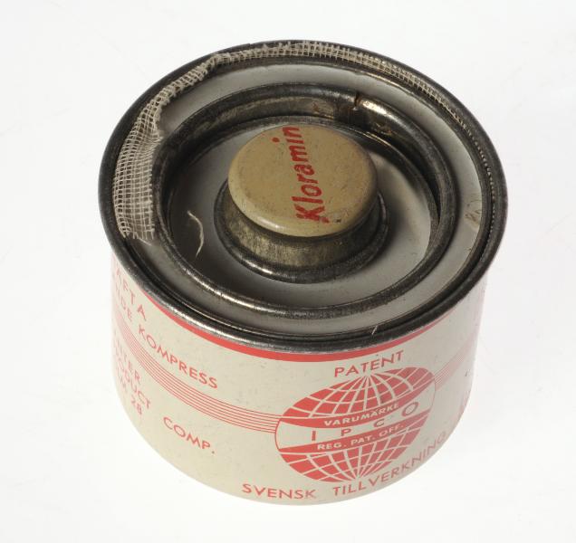 Rund ask med lock. Vit och röd text: "IPCO-HÄFTAN ÄR TVÄTTBAR, VATTENTÄT OCH LÄMNAR ICKE NÅGON AVFÄLLNING PÅ HUDEN...FABRIKANTER INTERNATIONAL PRODUCT COMP. STOCKHOLM 28". Locket har ett extra lock, vitt med röd text: "Kloramin".
