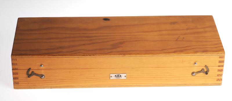 Rektangulär låda med lock som låses med två haspar. Lådan är indelad i fack för obduktionsbestick. Märkt på framsidan: KIFA, Stockholm.