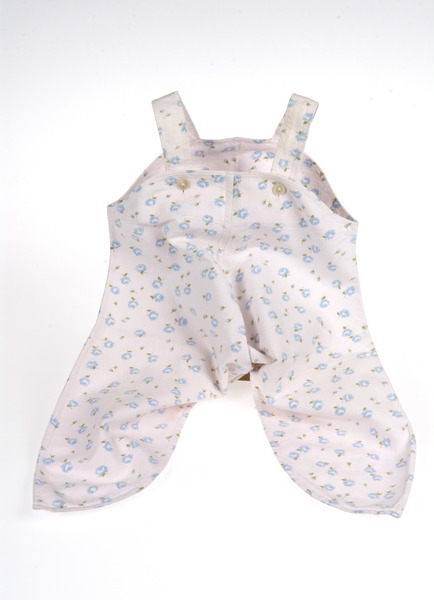 - Byxor sydda av svagt rosa bomullsflanell mönstrad med ljusblå rosor med gröna blad. Rymlig modell med två hängslen vilka knäppes med pärlemovit plastknapp på bröstlappen. Byxorna är hopsydda vid benslutet.