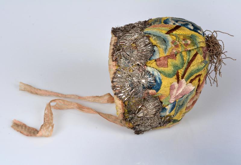 - Dopmössa för gosse. Av gult, mönstervävt siden broderat med silke i schattersöm med fantasiblommor i flera färger. 4.5 cm bred silverspets på framsidan. Rosa kantband fastsytt med rött silke. Dito knytbad. Mössan har 6 kilar och en tofs av silversnoddar där kilarna möts. Fodrad med oblekt lärft.