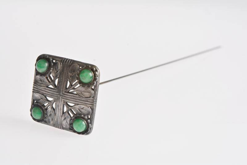 - Kvadratiskt nålhuvud av vitmetall med fyra stycken infattade stenar av grönt glas, alternativ halvädelsten. Ytterligare dekor av pressade blad och blommor i relief, där stenarna utgör blommornas mitt. Nålen något rostig.
