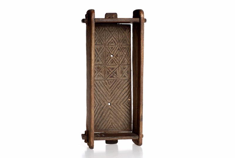 Rektangulär. Geometriska mönster. Gavlarna enkeltappade i långsidorna, tappningarna vågrätt dubbelreglade med träsprintar. Bottnen enkeltappad i gavlarna, tappningarna lodrätt dubbelreglade. Två avrinningshål i bottenskivan.