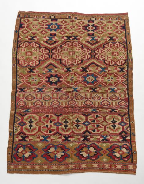 Spegel med sex breda bårder, alla olika. Smal bård längs med långsidorna, bredare bård vid kortsidorna. Färger; blått, rött, vitbeige, ljustgrågrön, varmrosa, grön, gulgrön, brunröd och svart. Mittsöm. Broderat; AVS PND ANO 1805.