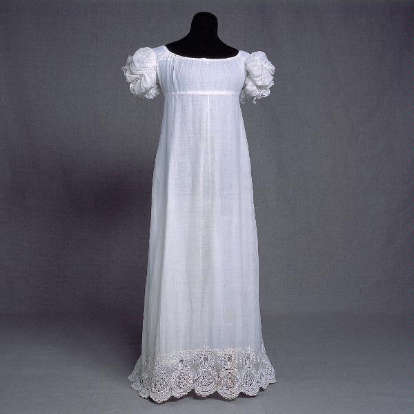 "Klänning av tunn bomull broderat med grovt bomullsgarn i ett på samma gång skirt och kompakt mönster, som ger tyget en eftersträvad gråvit, spindelvävseffekt. Den bör vara från omkring 1810-1815." ur katalogen till utställningen Modebubblor - design förr och nu 2001.; "Bomullen hade gått ner i pris. Den kunde nu importeras inte bara från Indien utan också från den amerikanska södern, där slavarbete gjorde råbomullen biligare. Det bidrog till att tunna vita bomullsklänningar blev moderna under empiren. Den här klänningen var lätt att bära, inte bara för att tyget var tunt. En kvinna som inte behövde forma kroppen med något korsettliknande, kunde röra sig ganska obehindrat". Uppklädd presentationstext 1.; "En klänning av tunn bomullsbatist. Bården nertill är broderad i klumpsöm och har en infälld knypplad spets. Puffärmen är rynkad med dragsko och nertill garnerad med knypplad spets". Uppklädd presentationstext 2.