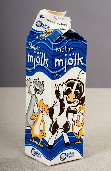 - För mellanmjölk 1,5 % 1 liter. Kvadratisk botten med sadelformad topp. Vit botten med dekor i form av den tecknade kalven Kalvin och hans vänner en hund och två katter samt en vågformad blå yta överst. Text: Sök Milk Energy stipendiet. Varumärke Skånemejerier.