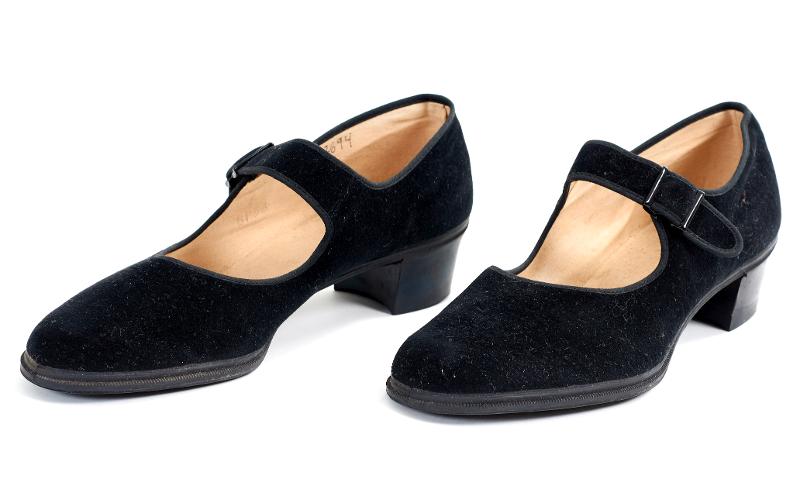 Svarta skor, damskor, med vristslejf. Tyget känns nästan sammets liknande. Slejfen knäpps med en tryckknapp. Skon är fodrad med ljusbeige tyg. 4 cm hög klack. Text i sulan; 36 BP TRETORN PATENT MADE IN SWEDEN.