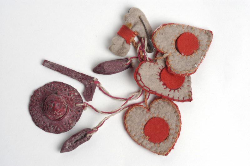 - Hängsmycke i Zakopanestil (stad i södra Polen): hatt, ett par skor, en käpp med yxa, 3 hjärtan av rött ylle fästa i ett snöre av bomullsgarn. Materialet i hatt och yxa och skor är okänt, möjligen tuggat bröd med röd färgtillsats.