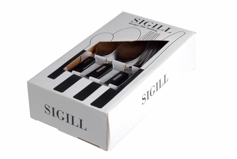 Rostfritt stål med svarta plastskaft. Sked: ovalt blad och rakt skaft, Br 4,2 cm, L 20 cm. Gaffel: fyra raka piggar och rakt skaft, Br 2,4 cm, L 20 cm. Kniv: rakt skaft och något svängt blad med tandning, Br 3 cm, L 22,5 cm. Tesked: ovalt blad och rakt skaft, Br 3 cm, L 14 cm.