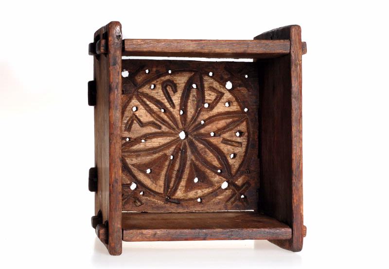 Kvadratisk, sexbladig blomma inskriven i cirkel. Gavlarna dubbltappade i långsidorna, tappningarna vågrätt dubbelreglade med träsprintar. Bottnen dubbeltappad i långsidorna, tappningarna lodrätt enkelreglade. I bottnen 33 avrinningshål. Inskription ILJE.