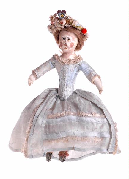 - Vitt skinn med målade ansiktsdrag, näsan sydd som en uppstående räls, pupiller av svarta pärlor och riktigt hår i lösa lockar, cendré. Klädd i krinolinställning med höftkuddar. Vadlång särk, panier, kort modell med en ring i nederkanten, öppningar i sidorna, knuten runt midjan. Linne, matelasserad stubb, skära sidenbyxor, ett par lösa fickor utanpå stubben. Klänning av ljusblått siden med öppnar i sidorna så att man når in till de lösa fickorna, kasack med fiskben i det linnefodrade livet, prydd, spetsar och silvertråd. Livet mycket styvt A långt. Troligen "fully boned" av fransk hovtyp. Huvudprydnad av spetsar och blommor verkar betydligt yngre. Står på en svart fotplatta med guldpapperskanter, upphängd i ett stativ. Skor av blå taft med guldtråd och skära rosetter.