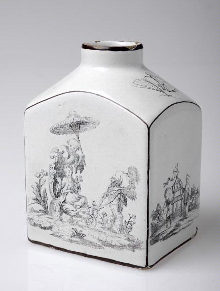 Tryckt dekor, sepiafärgad, endast kantkonturer är dragna med brun överglasyr. Långsidorna är dekorerade med det vanliga motivet: en kinesiska dras i snäckformad vagn, kortsidorna har ett mera sällsynt motiv med två kineser vid en klockstapel (?) - på vardera sidan mynningen är tryckt en fågel och en slända. Saknar lock.