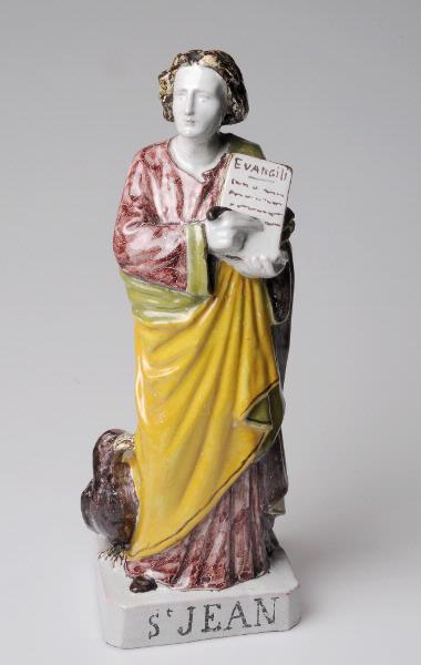 - Mansfigur iklädd lång dräkt i rödaktigt mangan. Gul mantel över ena axeln. I ena handen håller han ett papper på vilket han skriver med den andra, text "EVANGILI". Vid hans fötter sitter en stor fågel. Står på låg sockel med text "St JEAN".