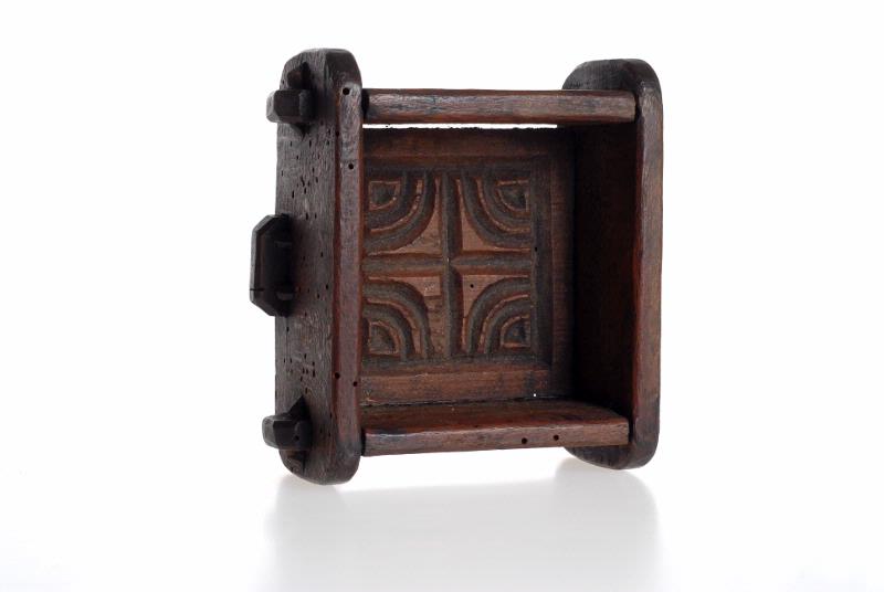 Kvadratisk. I bottnen skuret geometriskt mönster. Gavlarna enkeltappade i långsidorna, tappningarna vågrätt enkelreglade med träsprintar. Bottnen enkeltappad i långsidorna, tappningarna lodrätt dubbelreglade. I bottnens undersida utskuret: