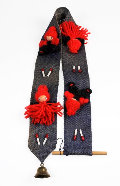 - Väggprydnad, blå. Längst upp är ca två cm av kanten nervikt och fastsydd med en slät och rund träpinne trädd igenom. På prydnaden sitter fyra garntomtar i rött och grått fastsydda med jämna mellanrum, och deras huvuden är gjorda av målade pappkulor. På prydnaden sitter också fem par julljus i vitt och rött fastsydda med jämna mellanrum. Längst ner sitter en guldfärgad julklocka fastsydd.