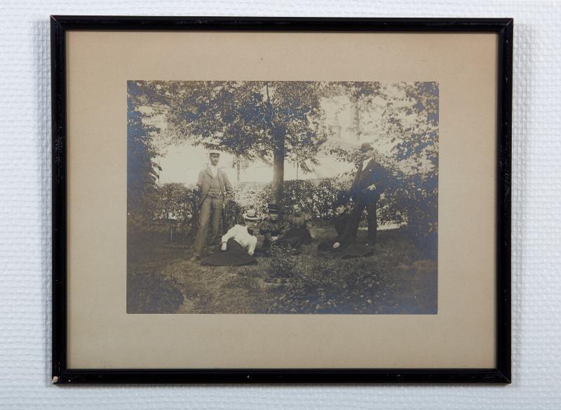 exteriör från Plantagelyckan 1 (nuvarande Karl XII gatan), Lund, 1890-talets början.I trädgården änkefru Johanna Mortensen med barnen Carl och Maria och tre gäster. Osignerat, troligen Lina Jonn. I glas och svart träram.