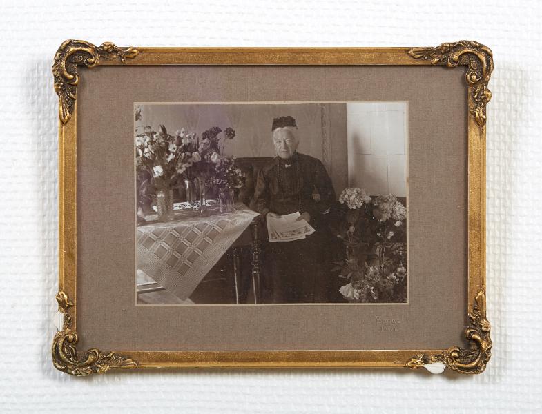 - Interiör från Plantagelyckan 1 (nuvarande Karl XII gatan), Lund, änkefru Johanna Mortensens 80-årsdag 1918. Jubilaren sitter i soffan i svart klänning med telegram i händerna. På bordet och på golvet blomsterbuketter. Fotograf Bagge.