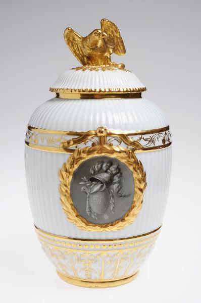 - Potpurrikruka med lock. På locket förgylld örn. Urnan kannelerad med reliefdekor i form av akantusblad vid foten, horisontella band och pärlstav på buken, förgyllt. Inom förgylld lagerfestong, porträtt i sepia föreställande Fredrik Wilhelm II av Preussen.