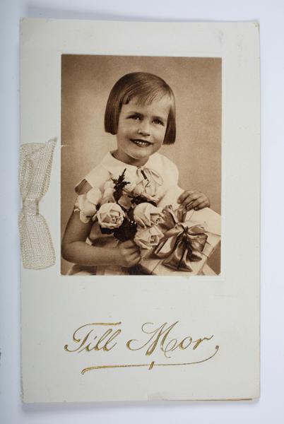 Krämfärgad kartong. På framsidan sepiatonat foto av välkammad flicka med rosenbukett och paket med stor rosett. Präglad text i guld: "Till Mor". Vit sidenrosett. Inlaga i tunnare papper med tryckt text: "Hjärtliga hälsningar på Mors dag från...Far och Inga [handskrivet i bläck]". På nästa sida tryckt vers: "Från tidigaste barnaår En bild uti mitt hjärta slår, Och där för livet bor. Den ler mot mig så gott och rart Och värmer mig så underbart. Det är din bild, min Mor. Och därför på din hedersdag Av hjärtans djup jag tackar dig."