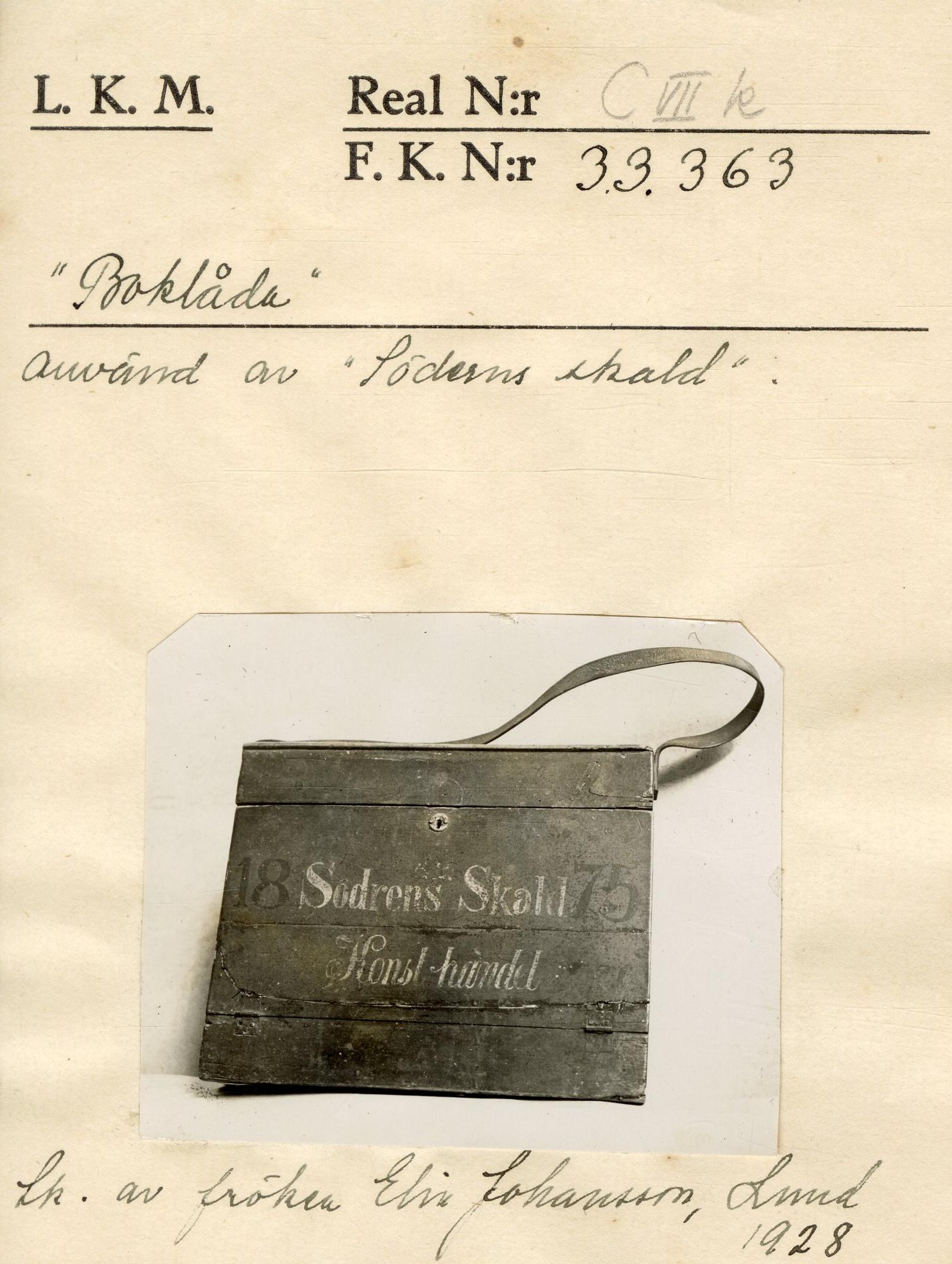 Låda för gårdfarihandel, av bräder, utvändigt blåmålad, inuti brunmålad; på framsidan en på gångjärn ledad nedfälldbar låsförsedd klaff med påskrift i gult "Södrens Skald" " Konst handel", och "1875" i rödbrunt. Bärrem av svart läder, fastspikad vid lådans övre gaveländar.