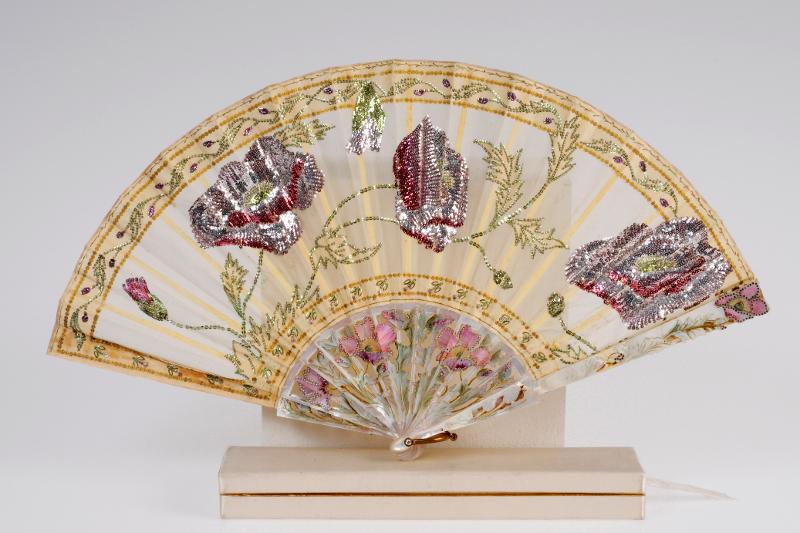 - Ställ och spröt av pärlemor och ben. Pärlemoren målad med motiv av rosa vallmor med gröna blad. Bladet av tyll, gulnad, med paljettbroderi föreställande rosa vallmor. Ögla i förgylld mässing, niten med fasetterade och folierade glasstenar. Tillhörande etui i vit sidenatlas med tillverkarens namn och adress i guld på lockets insida: DUVELLEROY 17, Passage Panoramas & 11, Boulevard de la Madeleine.