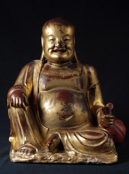 Sittande leende mansfigur, Budai, med bar, stor mage. Han är rakad på huvudet. Lutar vänster arm på en kudde. Lackerad i rött och guld. Lacken har släppt och skulpturen har flertalet sprickor.