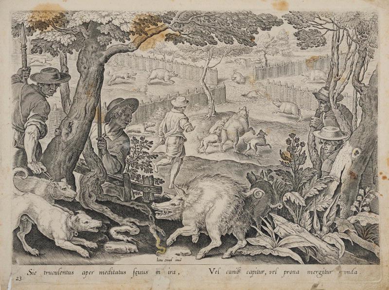landskap; jakt; jägare; hund; person; man; hatt; spjut; jaktredskap; träd; buske; växt; blomma; staket; vildsvin