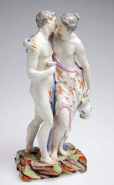 - Amor och Psyche. Man och kvinna som håller om varandra. Han naken, hon i en blommig klänning, nedhasad över ena axeln så att överkroppen blottas. I sin fria hand håller hon en kanna [underarmen med kannan är en rekonstruktion], han håller en bägare. Polykrom, ljus färgskala. Sockel i form av flat stenhäll.