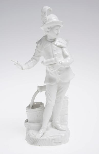 - Pumpmakare. Man som står framför en brunn med punp. Ur pumpen rinner vatten ner i ett laggkärl. Klädd i knäbyxa, knäppt rock, samt rundkullig hatt med brätte, i denna en stor fjäder. I ena haden håller mannen en klubba. Vit, omålad. Sockel med räfflad kant. Wegely perioden 1751-1757.