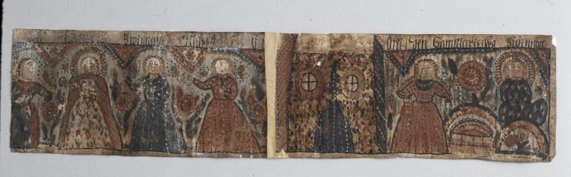 - Sönderklippt i två delar och uppklistrad på papp. Motiv: "Den kananeiska qwinnan Matth. 15 cap"" Färger: vitgrå botten, engelskt rött, blått, mörkgrönt, brunt, smutsgult, svart, vitt. Vikskador, fuktskador, färgbortfall, hål efter häftstift eller spik.