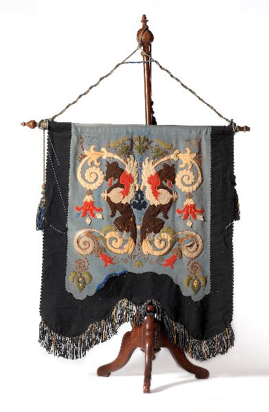 Rektangulär textil med sydd kanal upptill och två uddkantade tungor nedtill. Gråblå botten som ursprungligen varit intensivt klarblå, med ett stort applikationsbroderi med två bruna gripar placerade med ryggarna mot varandra. De har vita och röda vingar och omges av sirliga vita ornament, gröna blad och röda liljelika blommor. Längs sidorna och nertill kantband av svart ylletyg vilket är fäst med små franska knutar i silketråd i den uddformade ytterkanten. Nertill är den oregelbundna svarta bården kantad med en drejad frans i mörkgrått, mörkblått och gulbeige, ursprungligen blå och gul. Genom kanalen upptill är en rundstav i trä iträdd, en av sidoknopparna saknas. Från rundstaven hänger applikationsbroderiet och fler flätade upphängingssnoddar i blått och gult samt fyra stora duskor av samma sorts drejade fransar. Applikationerna är alla klippta ur olika sorters ulltyg, sömmar och broderi är sydda med silketråd i kedjesöm, stjälksöm, langett och franska knutar. Fodrad baktill med tunn blå rask. Mått utan frans L 78 cm, Br 68 cm. Frans 9 cm.Upphängningspinne L 84 cm.