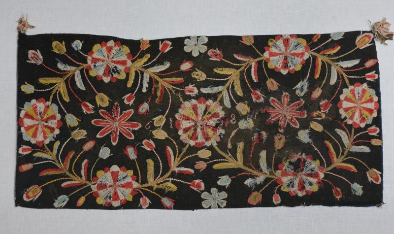 - Polykromt broderi med tvinnat ullgarn på svart ylle, tuskaft. Färg: vitt, ljusblått, rött, rosa, ljusrött, gult, grågrönt, grågulrosa. Motiv med blommor och kransar. Hörntofsar av bomull, linne och sidenband. Baksida i blå yllerips med (tvistrutor) randiga rutor i halvkrabba, gula, gröna, vita, rödbruna. Stppad. Randigt dynvar.