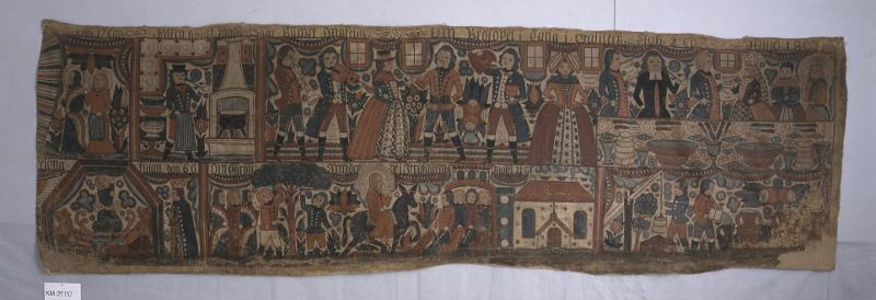 - Ihopsydd av tio våder. Motivet utgörs av två bildrader; i den övre till vänster ett sönderklippt fält vilket har framställt de fem förklaringarna. Textremsa: "--Matth. 17. Cap". Följande bildfält har textremsorna: "Brölopet i Kana", "Kåken kogar madd som bliver smakelig", "Om brölopet i Kana i Galileen. Joh. 2 Cap. Anno 1805". Den nedre bildraden har tre olika bildframställningar: 1. sönderklippt, framställer Daniel i lejonkulan, textremsa: "Liona = kulan. Dan 6 O". 2. textremsa: "Om Christi inridande i Jerusalem. Matth. 21?" 3.Tjänarna ösa upp vatten som sedan förvandlas till vin, vid brölopet i Kana. Färger: tegelrött, orange, blått, svart, brunt, grönt, vitt mot gulgråvit botten, kanterna gula.