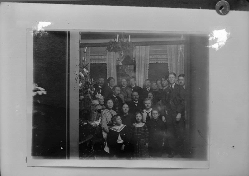 - Reprobild. Porträtt av en grupp män, kvinnor, unga män och unga kvinnor, pojkar och flickor klädda i kostymer, klänningar, sjömansdräkt, skjorta med slips vid julgranen. Fotograferat i helfigur. Okänt årtal. Beställare: Svensson.