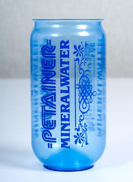 - Cylindrisk bägare, petainer, med tryck i blått på blåtonad, transparent botten. Samma text upprepas tre gånger i lodrätta rader: Petainer-MINERALWATER. Under texten finns ett mönster.