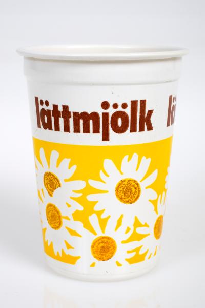 - Cylindrisk förpackning med tryck i brunt och gult på vit botten. Större delen av ytan upptas av en tecknad bild av prästkragar på färgad botten. Det finns också en innehållsförteckning och därunder logotypen för Helsingborgs mjölkcentral. I övre kanten står: lättmjölk. Märkt i botten PLM 250 35 76.