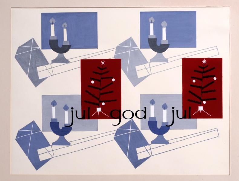 - Original för julklappspapper "Ljus/granar". Motiv i grå och blå nyanser, samt i rött, svart och vitt. Fyra likadana ljustakar mot rektangulära fält och åtta julklappar. Två rektangulära bitar papper med likadana granar. På motivet står med svarta bokstäver: jul god jul.