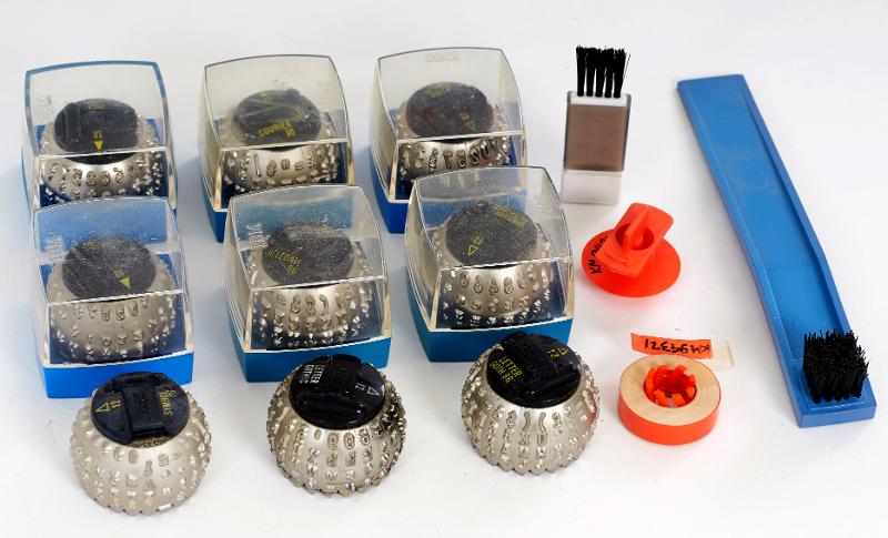 - Tillbehör till skrivmaskin IMB 196 c: nio skrivhuvuden med olika typsnitt (sex i plastaskar), två borstar (en blå och en vit), ett radéband med spole, ett färgband i vit pappask. De mindre föremålen i röd plastask.