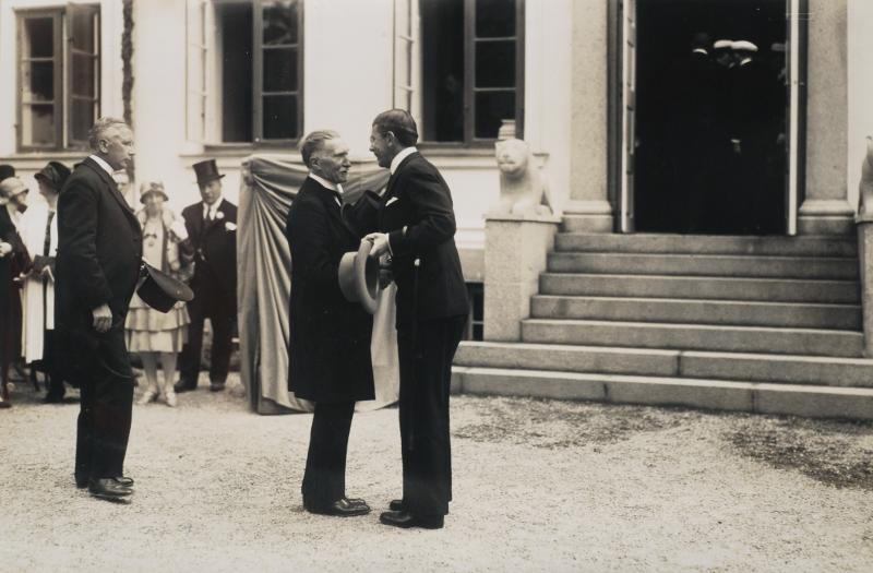 Invigningen av Vita huset, Kulturen, 10 augusti 1929. Kronprins Gustav Adolf skakar hand med intendent Georg Karlin, båda med hatten i hand. Bakom står ytterliagre en man med hatten i hand. Längre bak syns talarstolen, draperad i svenska flaggan. Den nybyggda trappan har två leende lejon, fönster och dörrar står öppna och i dörröppningen skymtar män i studentmössor.