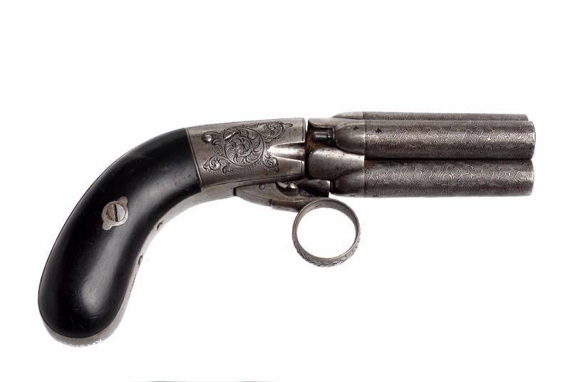 Ur utställningskatalogen: Belgaren Mariettes och amerikanen Allens revolvrar hörde till de mer spridda av de nya revolverkonstruktionerna från 1830-1850. Knippet med pipor är vridbart kring eb axel och skruvas av vid omladdning. Hanen spänns när avtryckaren dras tillbaka.