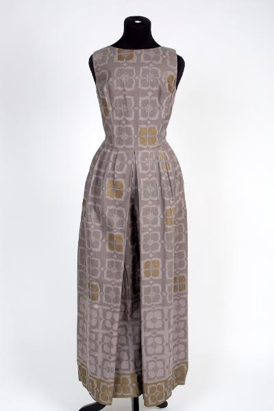 Ärmlös byxdress i mönster LOTUSBLOMMA av Sven Fristedt, i silvergrå och gammalt guld. 2 stora veck i midja som i sin tur har 3 mindre veck var, både bak och fram, ger 65 cm vida ben. Blixtlås mitt bak, figursydd, rundad hals. Kvalitet 911.