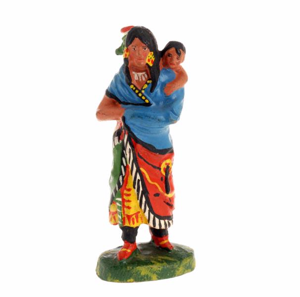 - 1 squaw (indiankvinna) med papoose (barn) buret på ryggen, klädd i fransad kjol målad i rött, grönt, gult, svart och vitt, blå sjal och fjäderskrud. 1 indian på huk med oval sköld i gult med mönster i rött och grönt, höjt spjut i ena handen, olivgröna byxor.