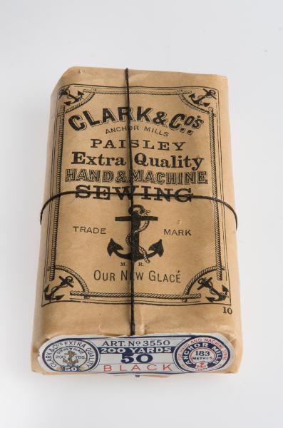 - Paket med 12 st små rullar med svart tråd, inslagna i gulvitt papper. På paketets översida fem svarta ankare och text: "Clark & Co's. Paisley. Extraquality Hand & Machine Sewing". På baksidan:" Clark & Co. Paisley. Scotland." Svart tråd runt om.